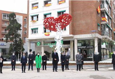 Don Felipe y Doña Letizia inauguraron un monumento en memoria y reconocimiento de los sanitarios fallecidos en el ejercicio de su profesión durante la pandemia por COVID-19, en la plaza de los Sagrados Corazones del madrileño distrito de Chamartín.